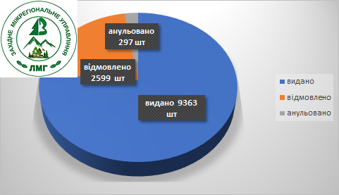 Отже, з отриманих 12259 заявок на видачу Сертифікатів видано 9363 Сертифікати – 76,4 % від кількості отриманих заявок; відмовлено у видачі – 2599 шт. ( 21,2%) та анульовано ( припинено дію) – 297 шт. (2,4%).