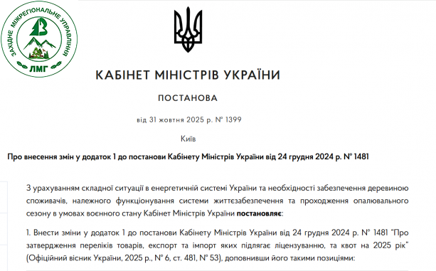 З 1 листопада 2025 року вступила в дію Постанова Кабінету Міністрів України від 31 жовтня 2025 року за № 1399 «Про внесення змін у додаток 1 до постанови Кабінету Міністрів України від 24 грудня2024 р. №1481».